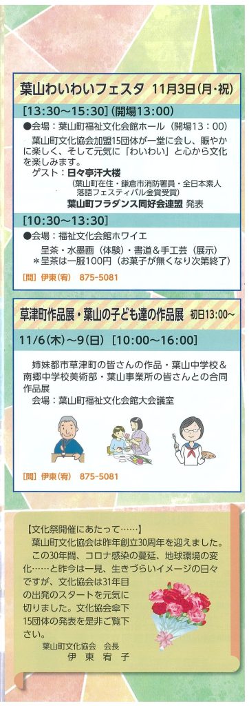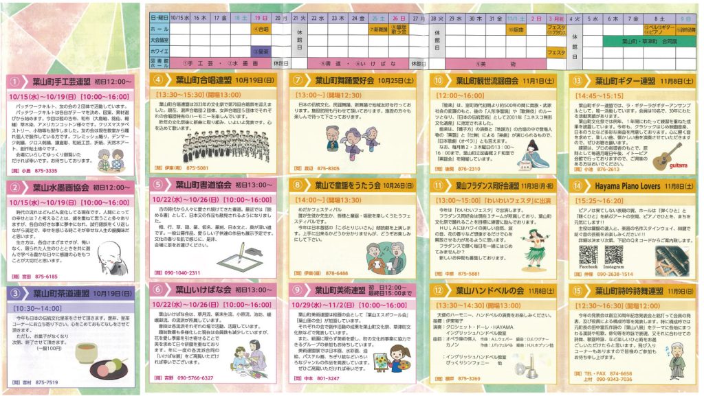 イベント 葉山情報 2025/09/28 【10月15日~開催】第59回葉山町文化祭/葉山町文化協会・葉山町教育委員会 葉山町文化祭を10月15日(水曜日)から11月19日(日曜日)まで開催いたします。 2024年9月28日掲載