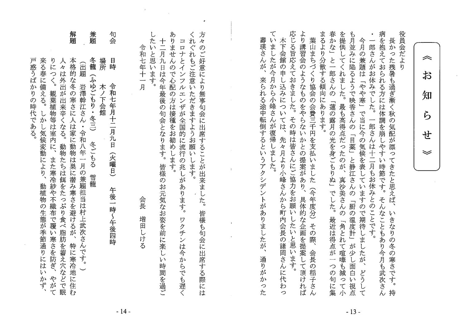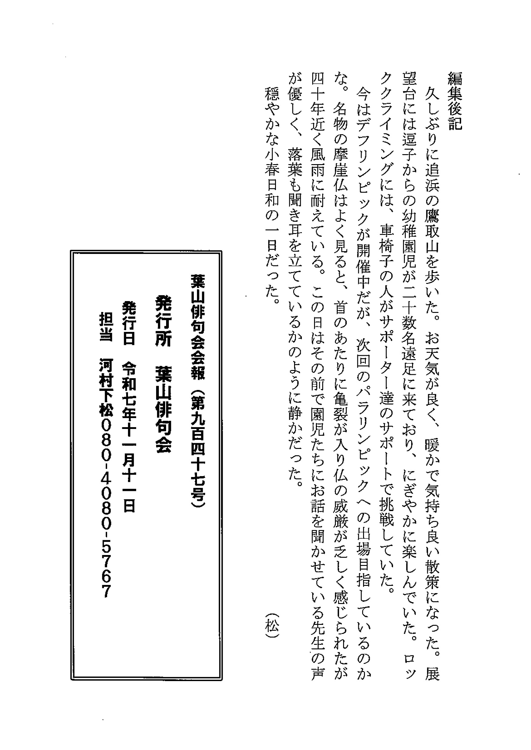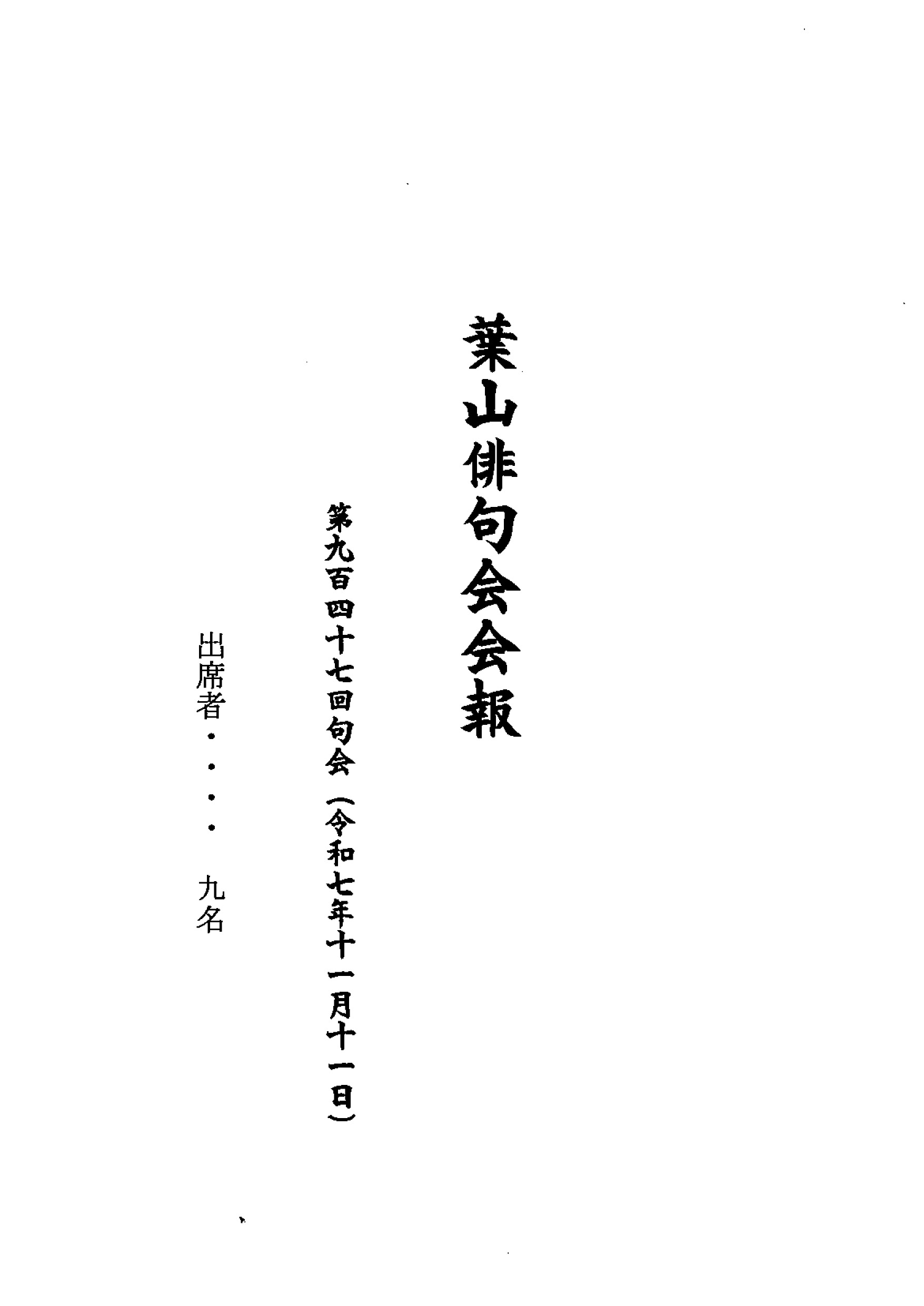 まちづくり団体 葉山レポート 2025/11/27 葉山俳句会会報(第947回句会)が発行されました。/葉山俳句会 葉山俳句会様より、第947回句会の会報が発行されました。 葉山まちづくり協会にて閲覧ができます(閲覧用バックナンバーもございます)。 ぜひご来館くださいませ。