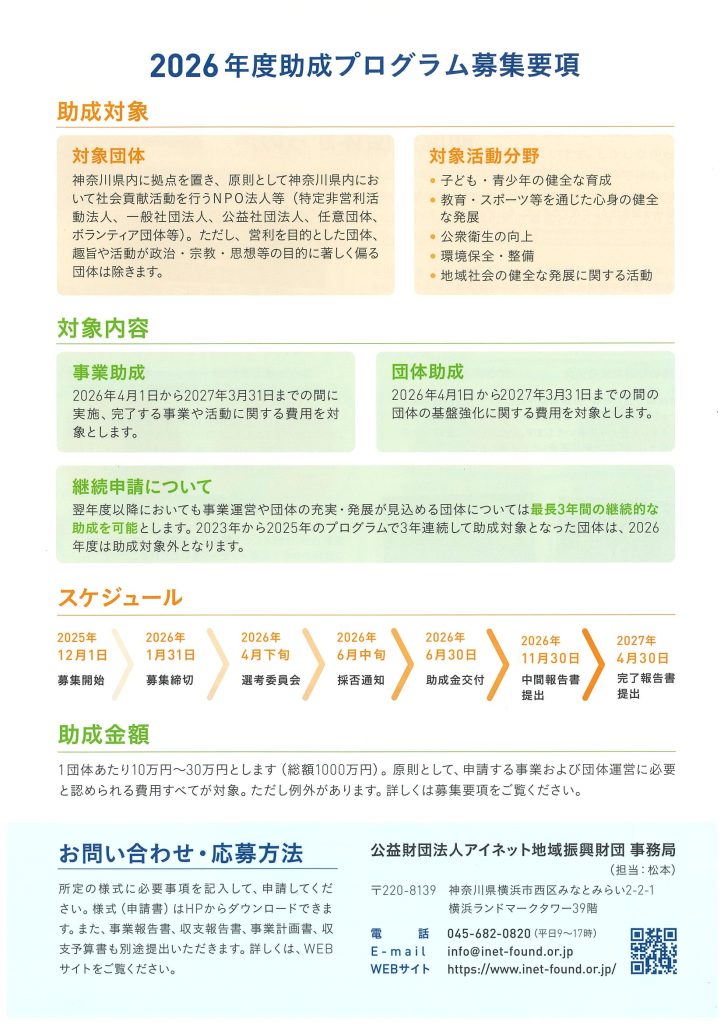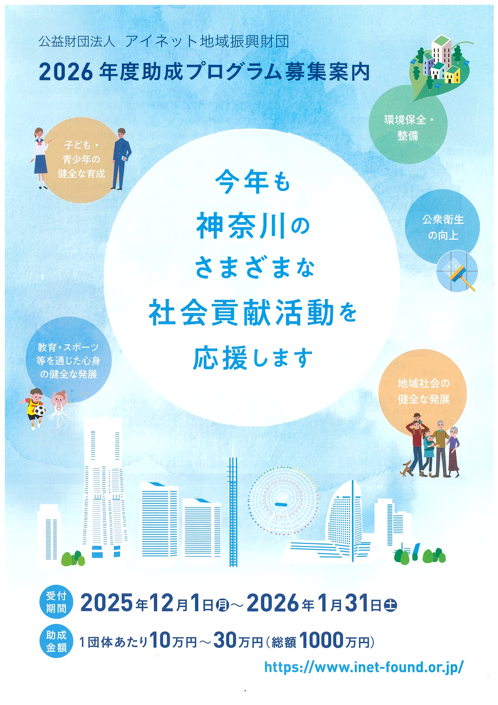 【1月31日締切】2026年度助成プログラム募集/公益財団法人 アイネット地域振興財団
