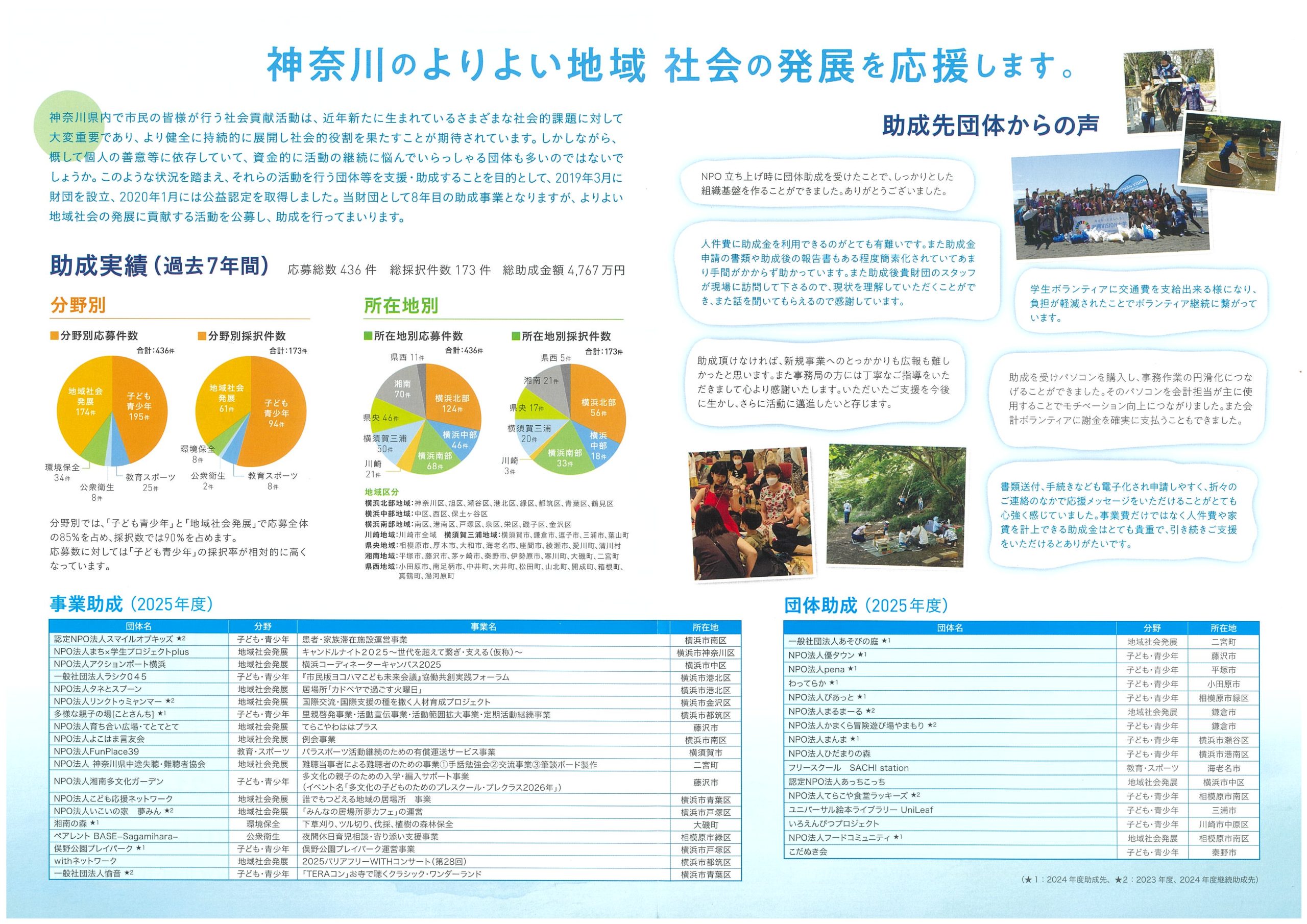 神奈川県内で市民の皆様が行う社会貢献活動は、近年新たに生まれている様々な社会的課題に対して大変重要であり、より健全に持続的に展開し社会的役割を果たすことが期待されています。しかしながら、概して個人の善意等に依存して、資金的には活動の持続に悩んでおられる団体等が多いのではないでしょうか。この様な状況を踏まえ、それらの活動を行う団体等を支援・助成することを目的として2019年3月に一般財団法人として設立し、2020年1月には公益認定を取得しました。