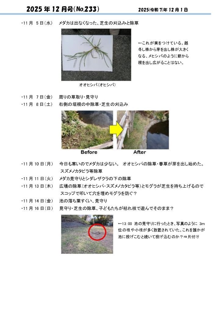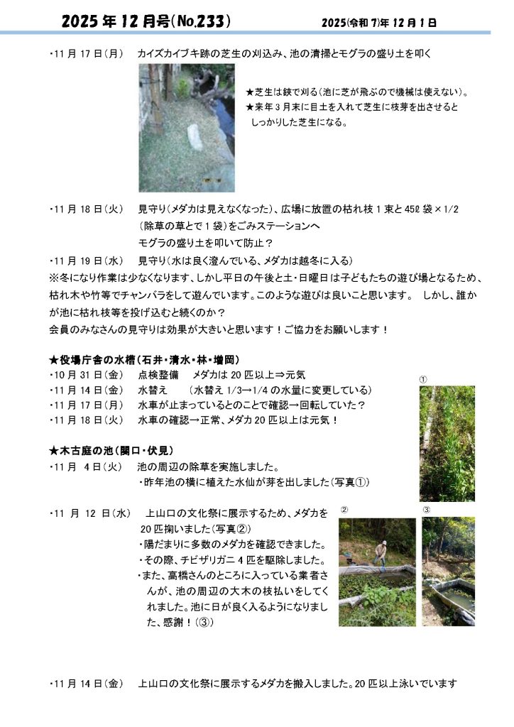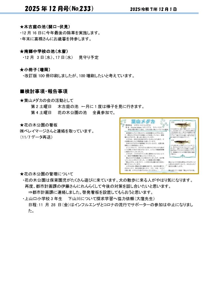 葉山メダカの会様より、会報「2025年12月号」が発行されました。