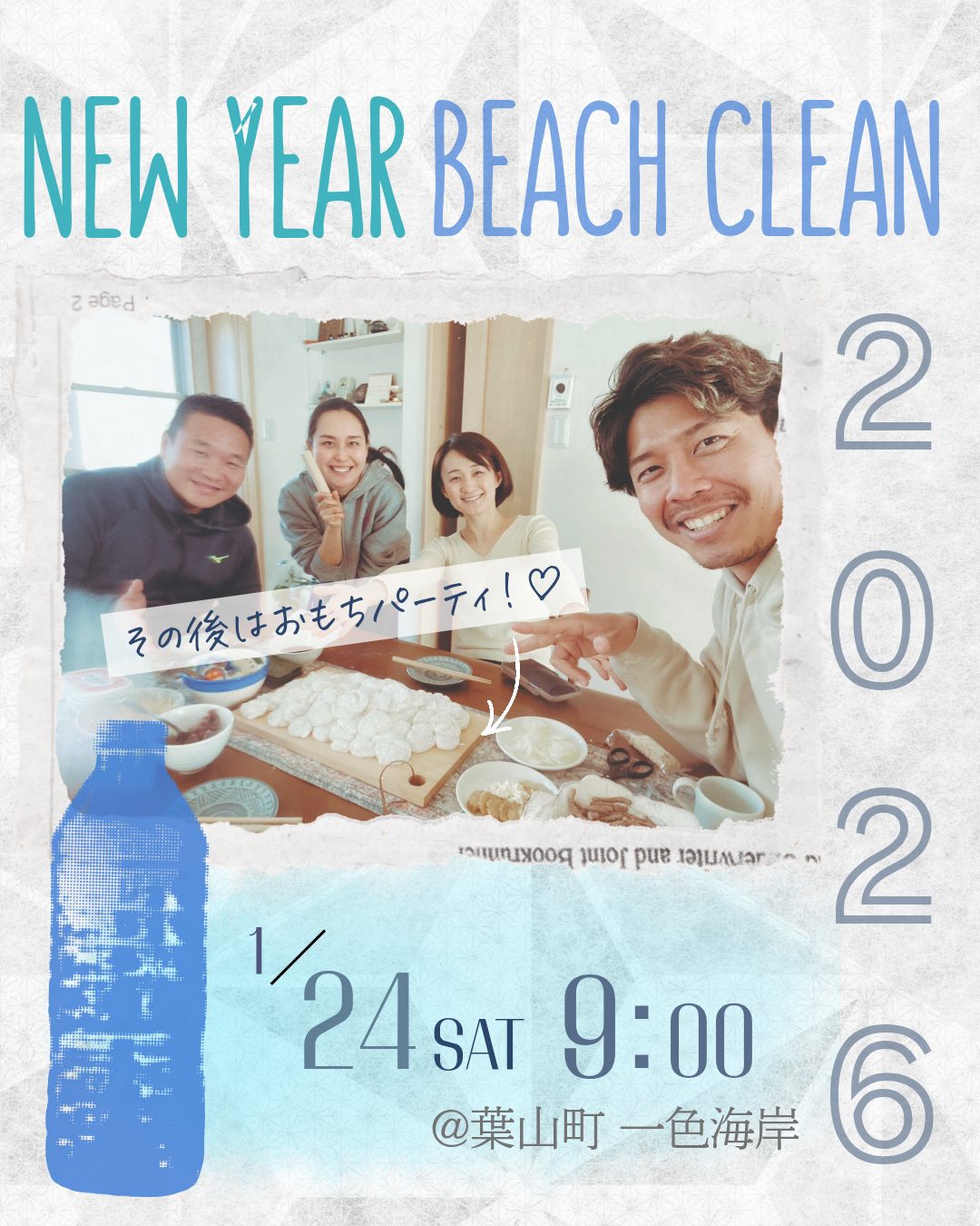 イベント まちづくり団体 2026/01/11 【1月24日開催】「ニューイヤービーチクリーン」開催のお知らせ/Barefoot Seekers Barefoot Seekersが新年のビーチクリーンイベントを開催します! ビーチクリーンのあとは、おもちパーティ! ぜひぜひご参加くださいませ! 日時:2026年1月24日(土) 9:00~ 場所:葉山町一色海岸 2026年1月11日掲載