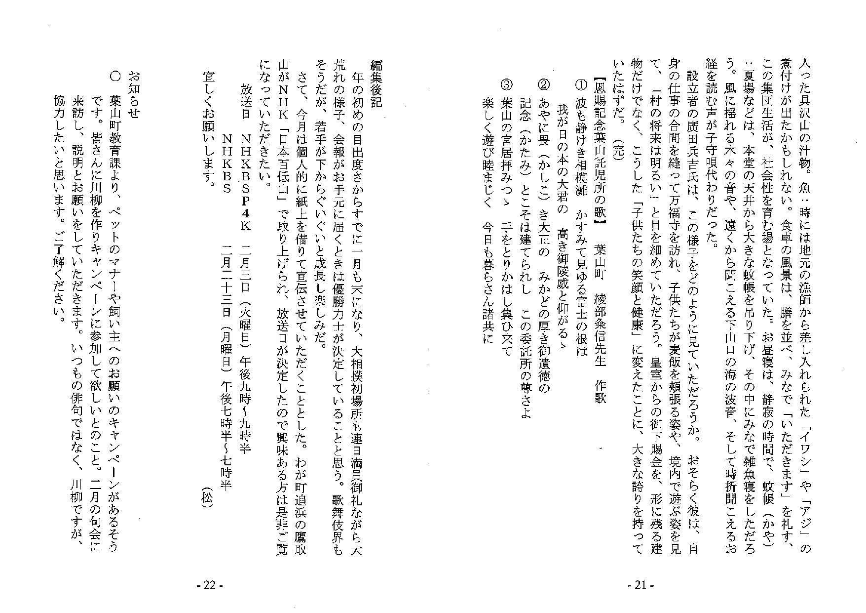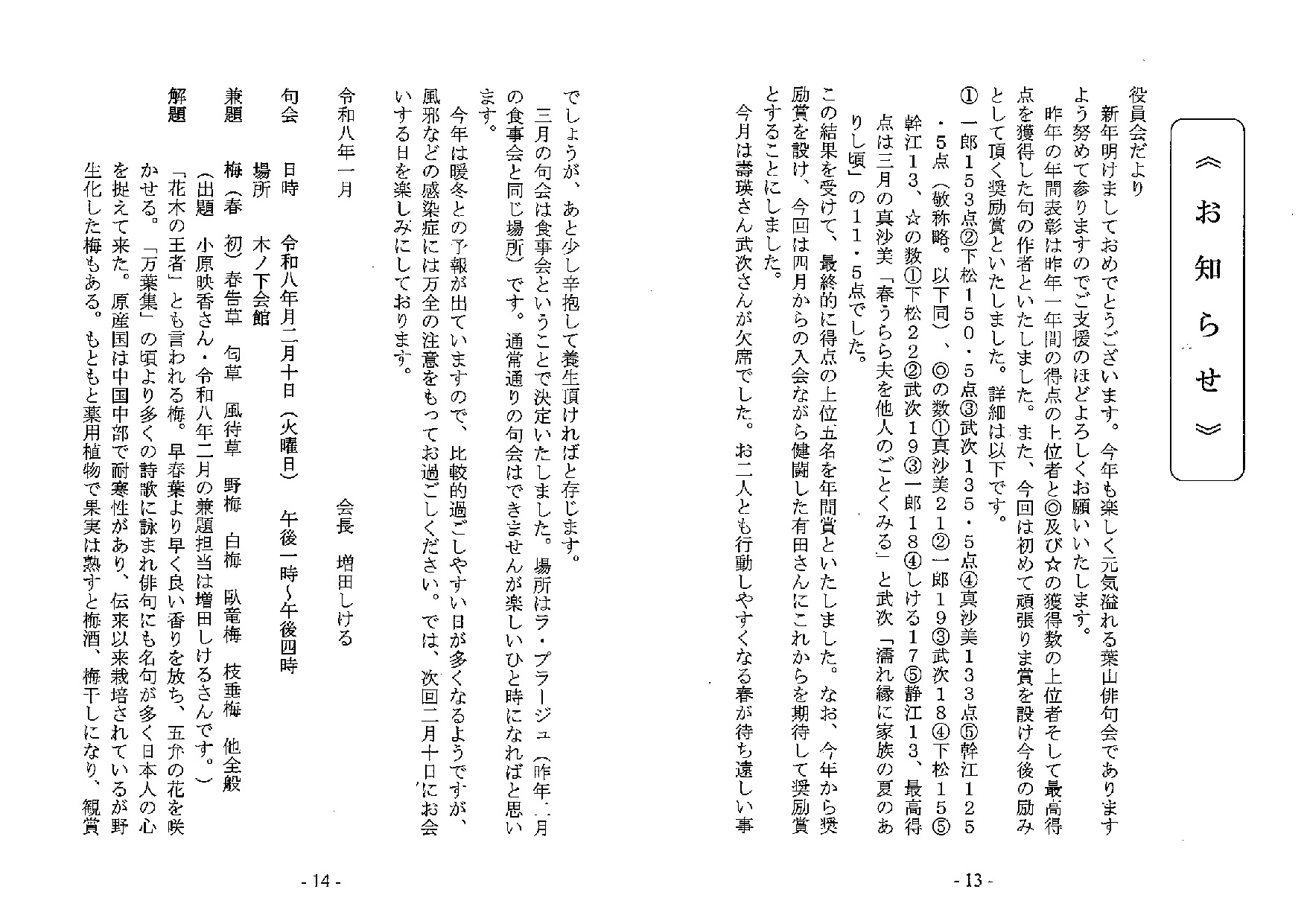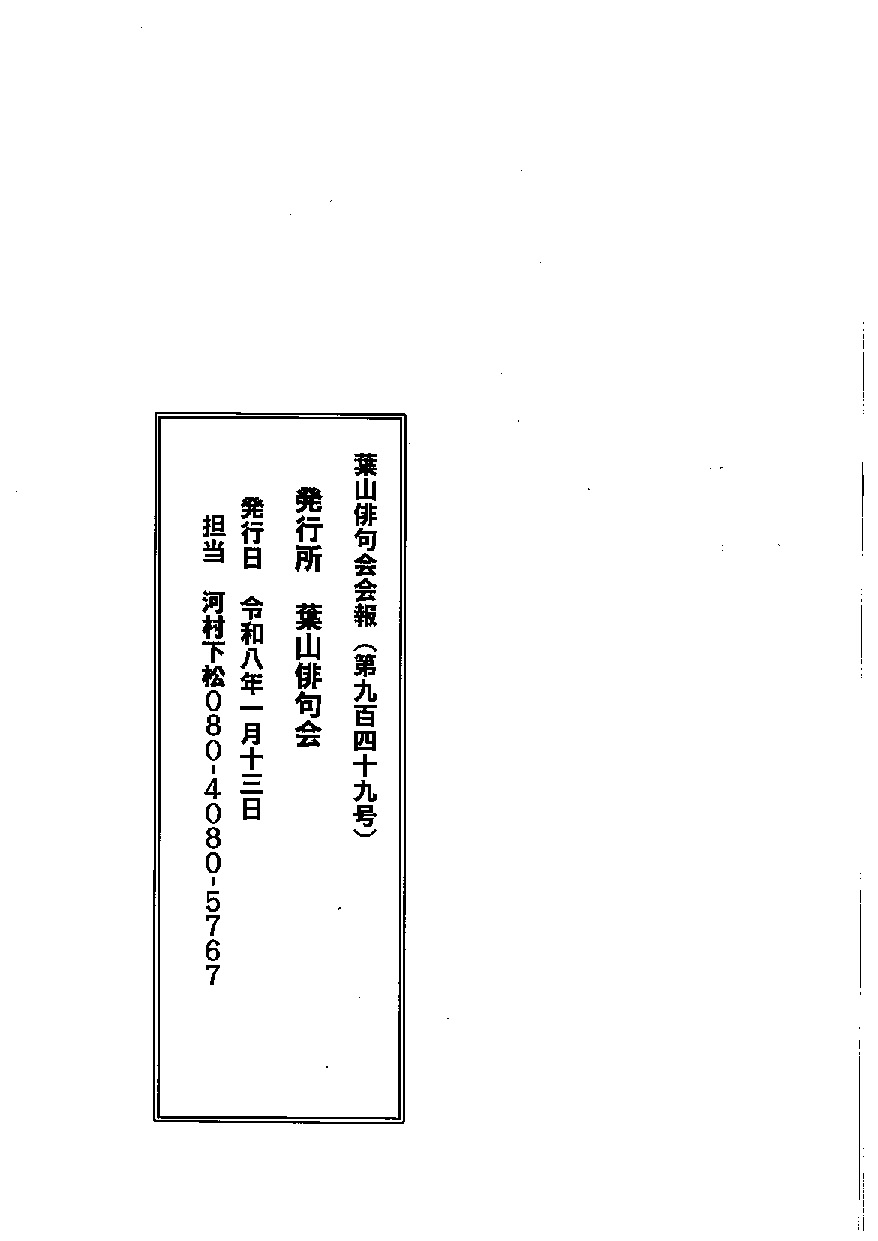 まちづくり団体 葉山レポート 2026/01/28 葉山俳句会会報(第949回句会)が発行されました。/葉山俳句会 葉山俳句会様より、第949回句会の会報が発行されました。 葉山まちづくり協会にて閲覧ができます(閲覧用バックナンバーもございます)。 ぜひご来館くださいませ。