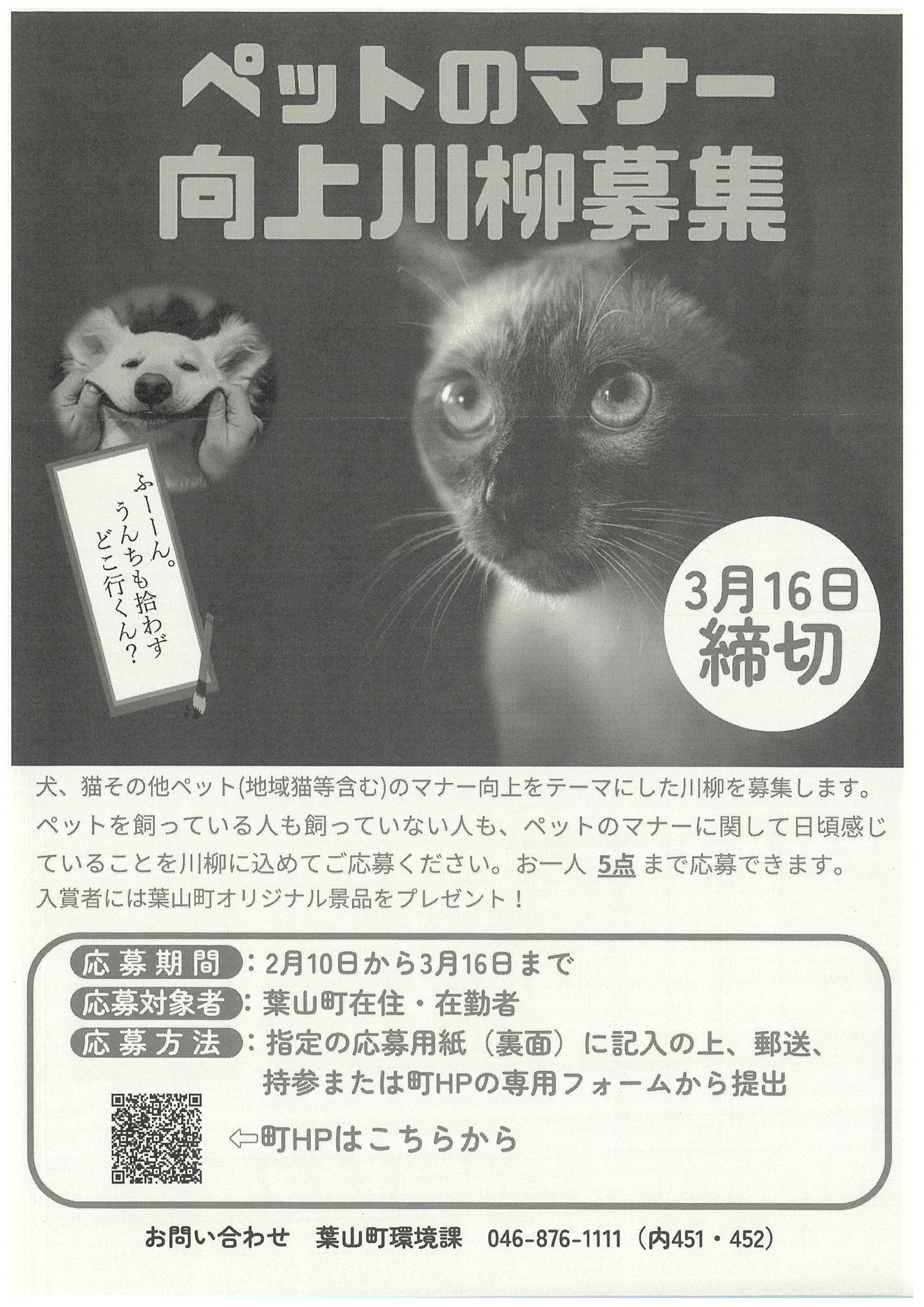 【3月16日締切】「ペットのマナー向上川柳」募集のお知らせ/葉山町 環境課